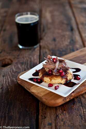Duck Confit on IPA Potato Cakes with Stout Pomegranate Sauce