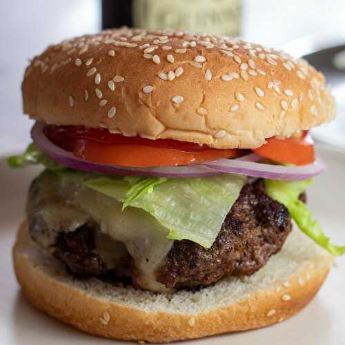This juicy burger with roasted garlic aioli, caramelized onions, bacon, and cheese on a Hawaiian roll bun is a mouth-wateringly delicious restaurant-style treat.