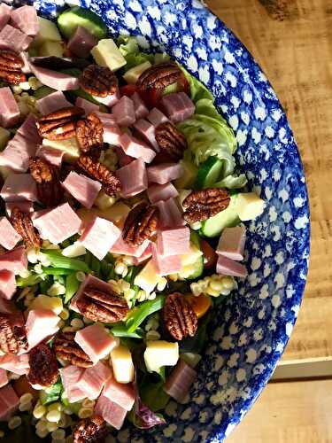 Smoky ham, sweet and crispy cornbread croutons, salty cheddar cheese, tart peaches, crunchy and sweet pecans, bright and tangy scallions - the best salads feature a little lettuce and a whole lot of goodies.