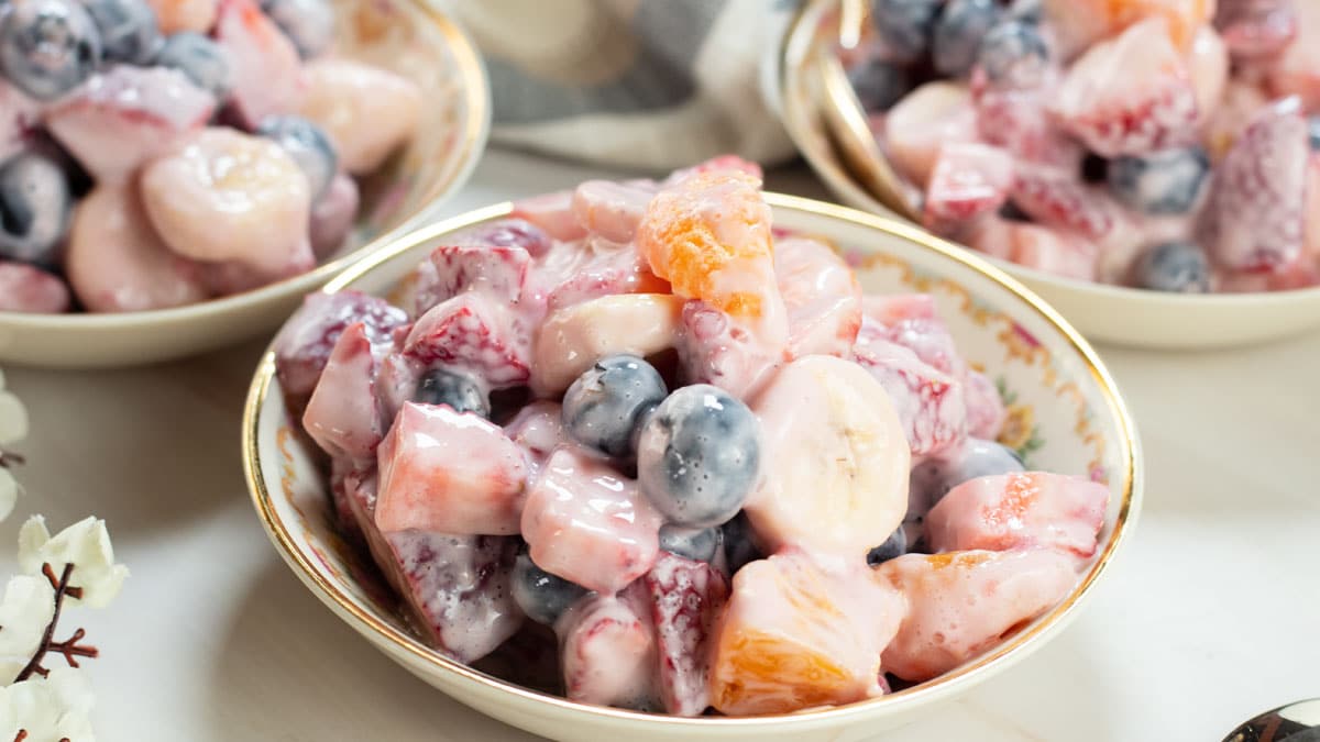 This fresh tropical fruit salad is tossed with a lightly sweetened and slightly tangy honey yogurt dressing.