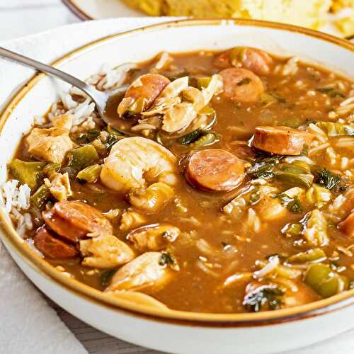 This gumbo soup recipe with chicken, andouille sausage, and shrimp is a classic Southern comfort dish straight out of Louisiana! This gumbo is great for any day of the week and it is full of Cajun flavor.