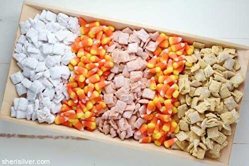 Candy corn muddy buddies are my new favorite Halloween treat!