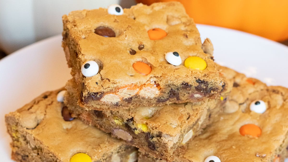 Get in the spirit of this spooky season with these adorable Flourless Halloween Reese's Cookie Bars! These are like monster cookies only in bar form with a delicious chocolate peanut butter topping and Reese's Ghosts for a ghostly affect!