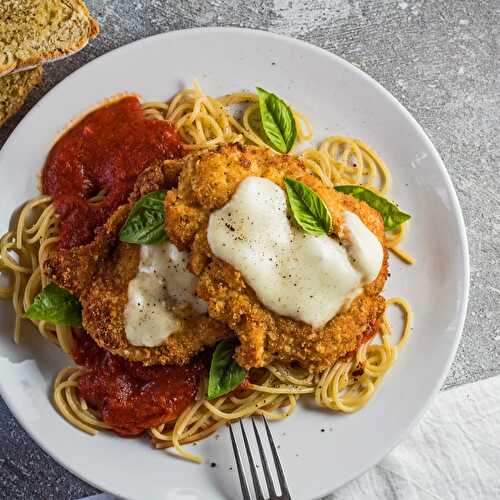 This delightfully crispy Chicken Parmesan, also called Chicken Parmigiana, is a classic Italian entree that combines a Parmesan breaded chicken breast with mozzarella, marinara, and pasta! The versatile chicken can be served with pasta and alfredo sauce,.