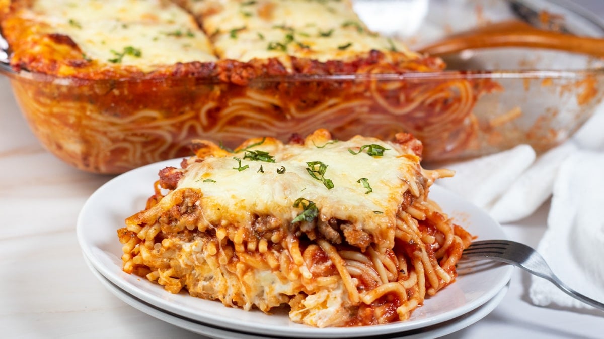 Baked Spaghetti and Meatballs is an easy casserole with layers of spaghetti coated in sauce, cheese, and meatballs! This tasty comfort food dinner can be loaded with cheesy goodness to please your entire family! Plus, it's the perfect use of leftovers.