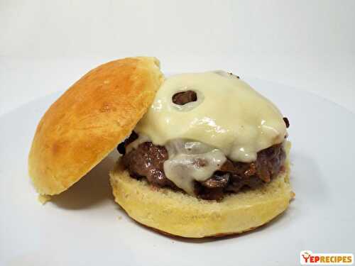 Burgers seasoned with salt & pepper then topped with mushrooms, caramelized onions, and melted Swiss cheese.