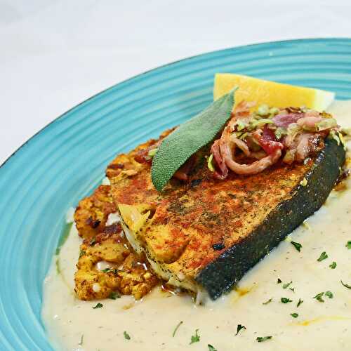 Flaky pan seared halibut steaks with a creamy lemon dill white sauce.