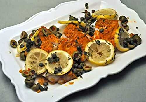 Baked Cod with a light, flavorful crust finished with Lemon, Olives and Capers