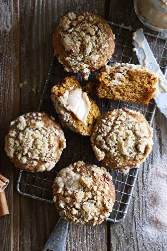 Moist bakery style pumpkin muffins topped with an irresistible cinnamon pecan streusel and homemade whipped maple butter to top.