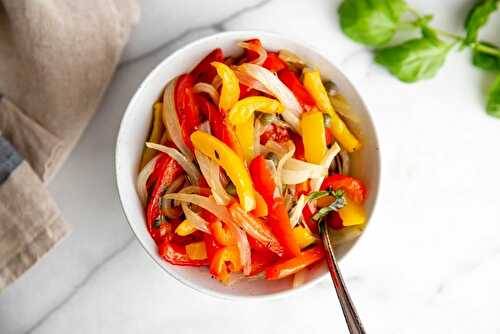 These slow roasted peppers and onions are silky and sweet, with brightness from sherry vinegar and capers.