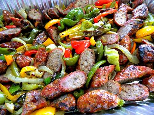 Baked Italian Sausage, Sweet Potatoes, Peppers, and Onions is a full meal on one pan! Your family won't be able to get enough forkfuls of these juicy sausages, tender sweet potatoes and roasted vegetables!