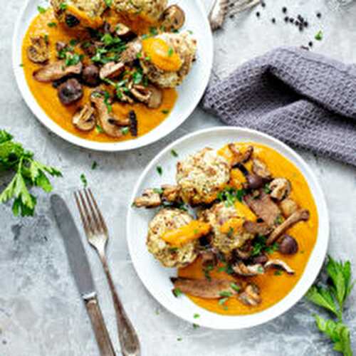 Vegan Hungarian Bread Dumplings with creamy root vegetable sauce and tahini roasted mushrooms.