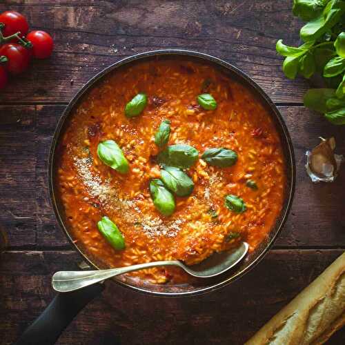 A creamy and delicious sun-dried tomato risotto recipe, perfect for any hassle-free vegan or meat-free meal as it is made with staple pantry ingredients.