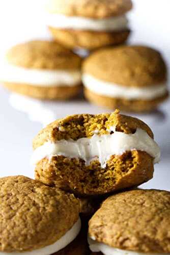 These pumpkin whoopie pies are made by sandwiching two light and soft pumpkin cookies between a creamy, dreamy cream cheese frosting.