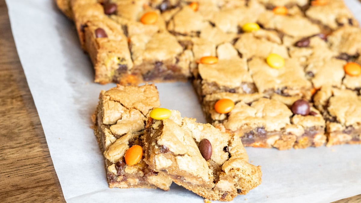 These Reese's Pieces bars are chewy and sweet and are the perfect combination of chocolate and peanut butter! The peanut butter-packed bars are loaded with bite-sized peanut butter candy and chocolate chips.