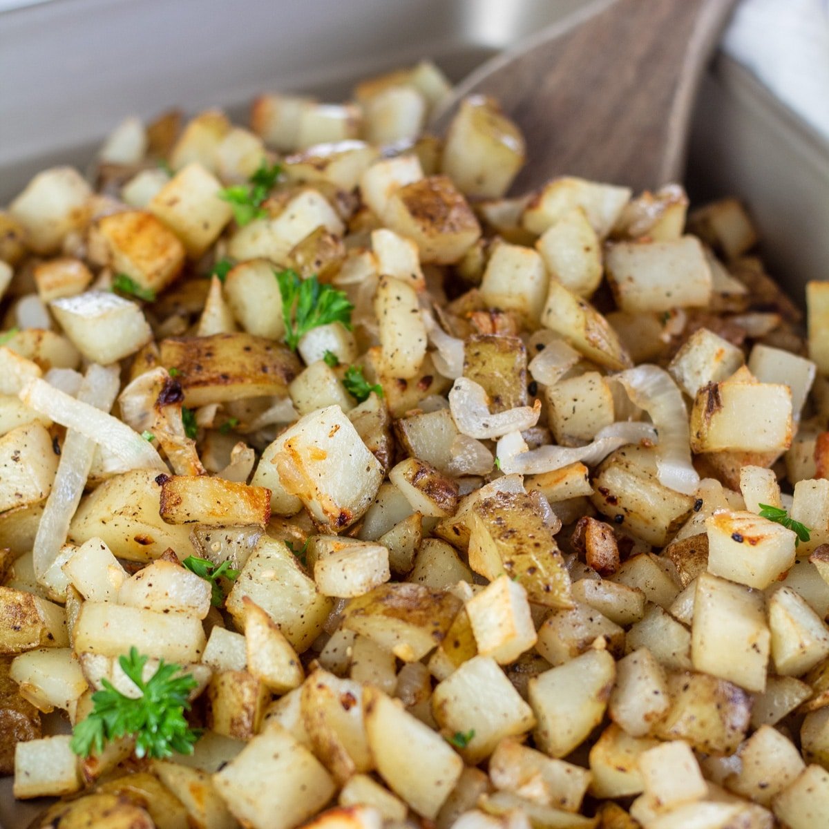 Roasted potatoes & onions are a simple and easy side dish that pairs well with everything and everyone loves! They are seasoned with some common spices and tossed in oil for an effortless addition to any meal.