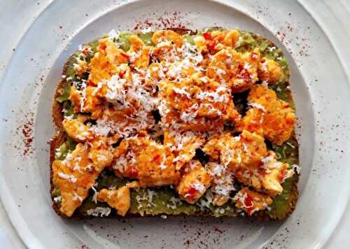 Avocado Toast with Harissa Scrambled Eggs is a quick, healthy, and delicious breakfast made with avocado-topped toast, spicy harissa scrambled eggs, and a grating of some fresh cotija cheese.