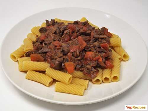 Cremini mushrooms and fresh vegetables slow cooked into a thick sauce and served over rigatoni pasta.