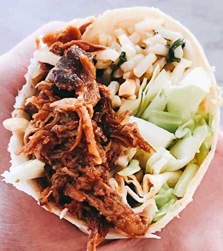 Sweet barbecue pulled pork made in the instant pot or slow cooker piled high on top of cool crunchy layer of coleslaw in a lettuce wrap.