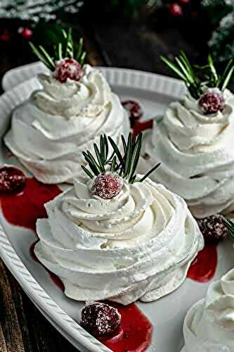 Combining a rosemary scented cranberry curd with whipped cream into airy pavlovas is a beautiful and easy dessert for the holidays with a stunning presentation.