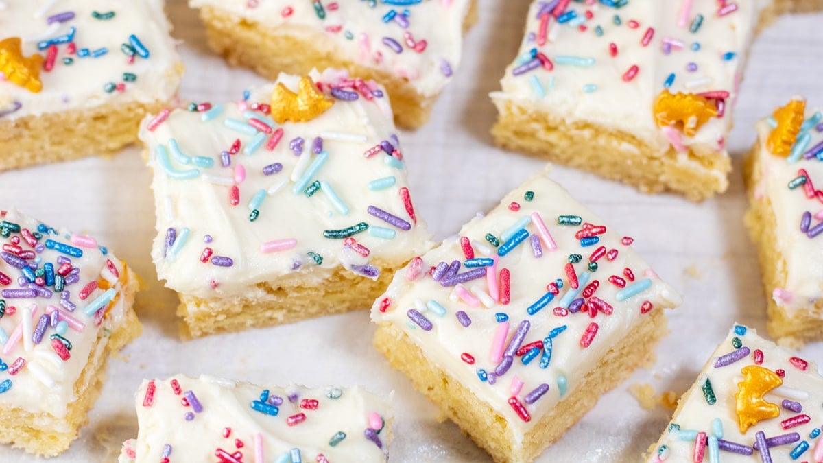 Birthday Confetti Frosted Sugar Cookie Bars are soft and thick with just the right amount of ultimate Birthday Confetti Frosting.