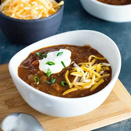 This hearty chili without beans is packed with crumbled ground beef, tomatoes, onions, and a boldly flavored seasoning mixture.