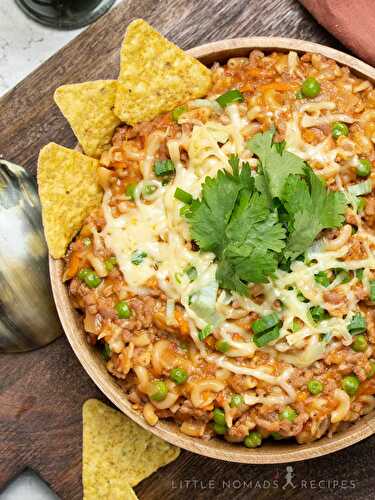 Easy Chili Mac and Cheese without beans is a mash up between two beloved kid recipes: Chili con carne y Mac and cheese served with some crispy tortilla chips.