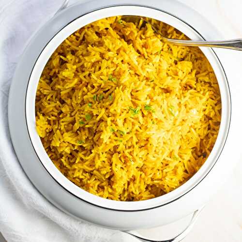My delicious and quick Turmeric Rice is the perfect Indian-inspired side dish for any night of the week! This easy fluffy rice is packed with flavor from turmeric and aromatic seasonings to make an incredible side dish that goes well with any main course!