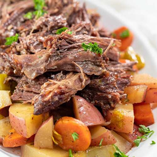 This Yankee pot roast is melt in your mouth tender with plenty of savory potatoes, onions, and carrots to enjoy! The meat is roasted low and slow with a simple combination of red wine and beef broth that keeps it delectably moist and juicy.