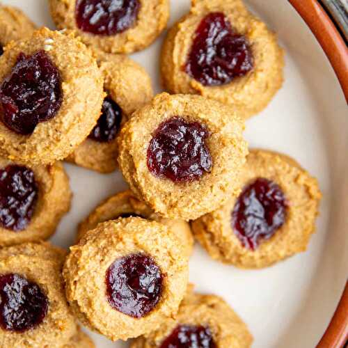 These gluten free almond thumbprint cookies have an irresistible marzipan-like flavor, a chewy center and a burst of sweet jam in the center.