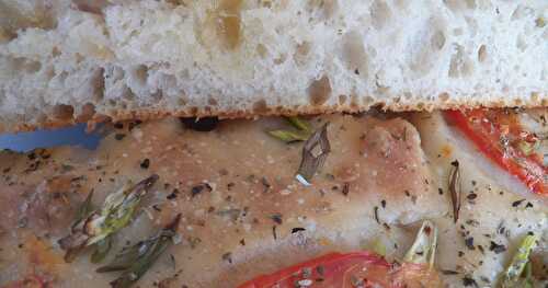 Simple Focaccia : olives, cherry tomatoes, fresh thyme or rosemary and olive oil on golden crispy focaccia bread give you the best experience of cucina povera !