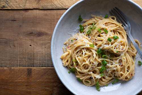 A recipe for rich, salty, savory miso butter with a little heat and a lot of roasted garlic goodness, coating swirls of noodles.