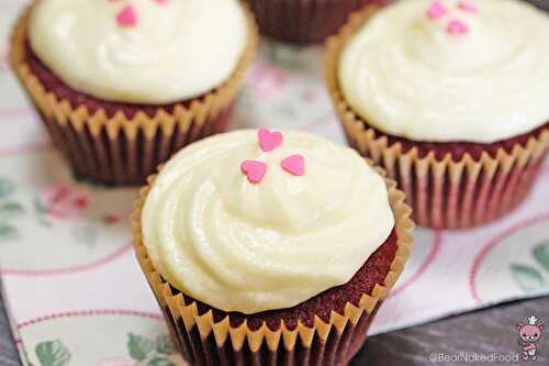 A cupcake with a velvet texture, red color, and of course a rich cream.