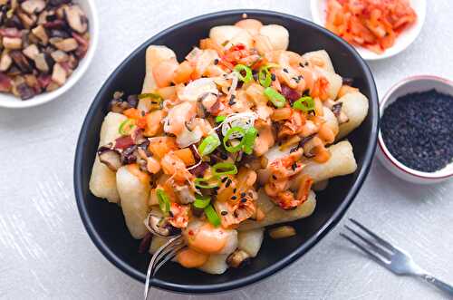 These loaded grilled rice cakes are topped with chopped kimchi, sauteed shiitake mushrooms, and smothered in kimchi aioli.