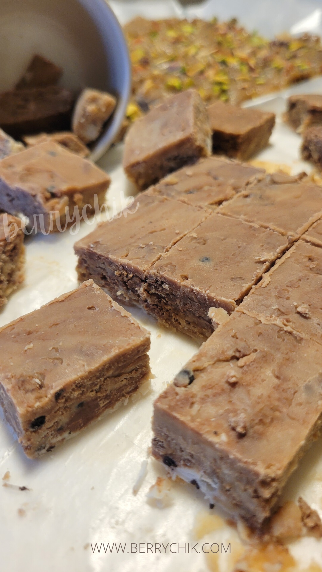 A delicious white chocolate, coffee flavored fudge laced with toffee chips.