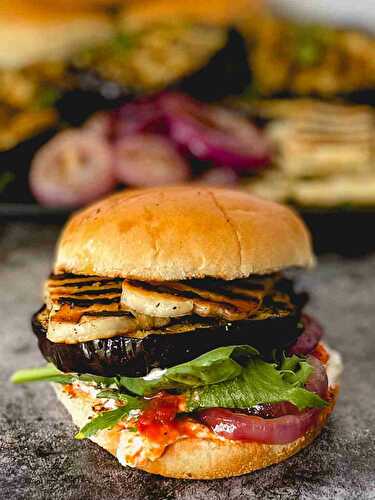 This delicious veggie burger is stacked with grilled eggplant, salty grilled halloumi and a spicy harissa labneh sauce!