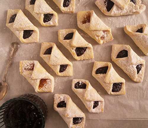 Hamantaschen, a triangular jam-filled butter cookie, is the traditional food for the Purim holiday.