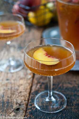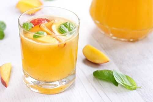 Peach and basil white sangria, made with juicy peaches, white wine, lemonade and fresh basil.