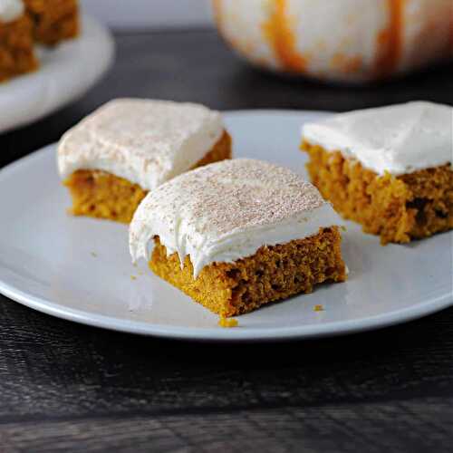 A delicious cake-like bar with warm pumpkin flavors, smothered in luscious cream cheese frosting.