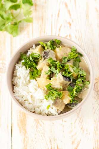 Spicy and creamy vegan Thai green curry with eggplant and potatoes.