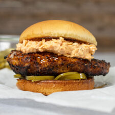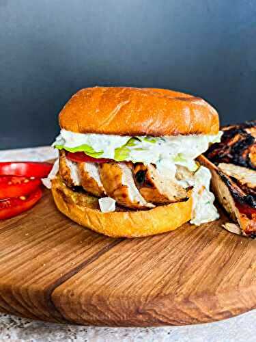 This grilled chicken sandwich is piled high with juicy, caramelized grilled chicken on a bun with lettuce, tomato, and a creamy-tangy sandwich sauce that’s seriously the best out there!