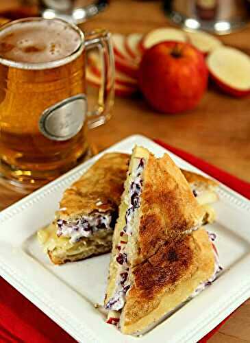 Brie is grilled on Ciabatta bread with apple slices and a cranberry, whole grain mustard and honey flavored mayonnaise.