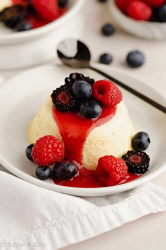This Sweet Corn Panna Cotta with Fresh Berry Sauce is a luxuriously creamy small batch dessert made with freeze-dried sweet corn and topped with a summer berry sauce and fresh fruit.
