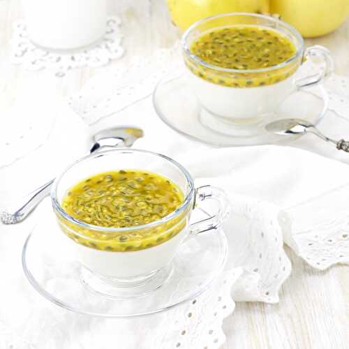 Coconut Panna Cotta with a topping of delicious passion fruit, those tropical flavors will make you fly right to the turquoise water and coconut lands.