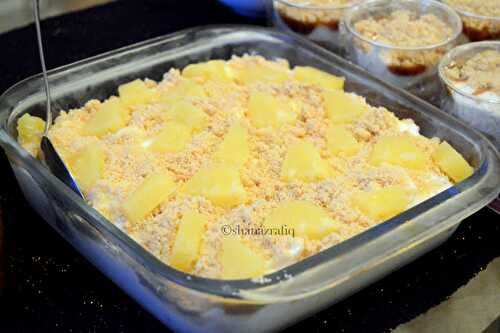 Pineapple Cream is a no-bake dessert with pineapple and jelly combined with sweetened cream and a biscuit topping.