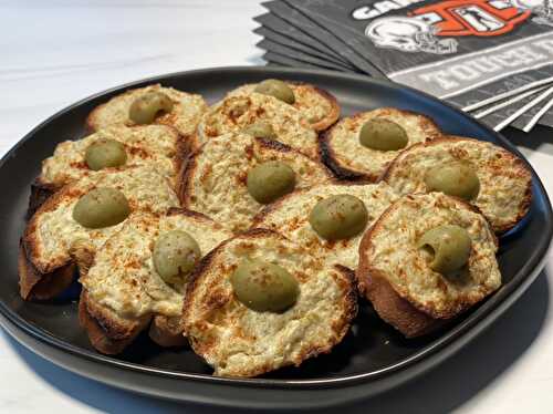 This is a tasty vegan dip which sits on crispy crostini.