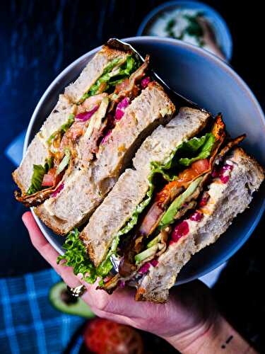 Spiced aubergine slices on a delicious sandwich with the best and creamiest homemade hummus.