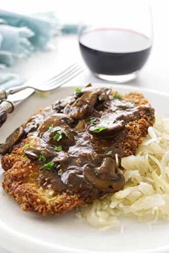Jäeger Schnitzel and Mushroom Sauce, thin, crispy, breaded pork cutlets served with a rich white wine mushroom sauce spooned over the top