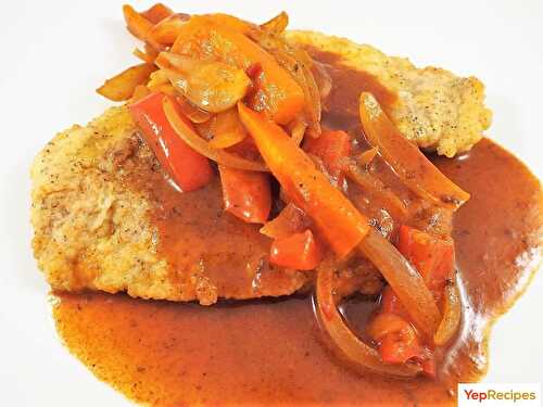 Chicken schnitzel served with a German sauce made of peppers, onions and paprika.