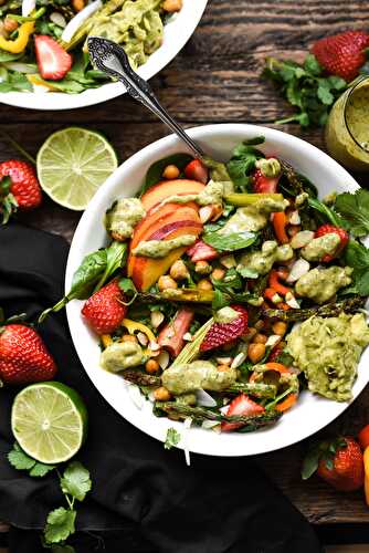 A fresh and fruity filled salad topped with a dressing that's super creamy without any dairy.